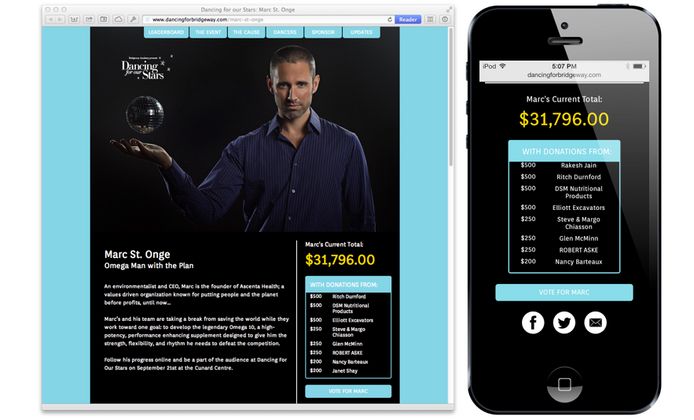 DancingForBridgeway.com is where supporters go to make online donations, track their favourite dancers' progress, browse photos, receive updates from the event organizers, and view a real-time leaderboard for every dancer in the competition. With a responsive design, this is made possible from any device ranging from smartphones to desktop PCs.