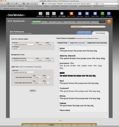 SiteWelder has 3000 live sites and approximately 1000 demo sites running off of one directory. The system allows users to switch the layout, colors and logos on the fly using a few mouse clicks. Recently we have added support for Vimeo videos, using Vimeo's XML feeds so that as users add video to their Vimeo accounts, or albums, they automatically appear in galleries they have set up on their SiteWelder account. We have also added support for Google Web fonts, allowing users to tailor the look and feel of their sites on a whole new level.
